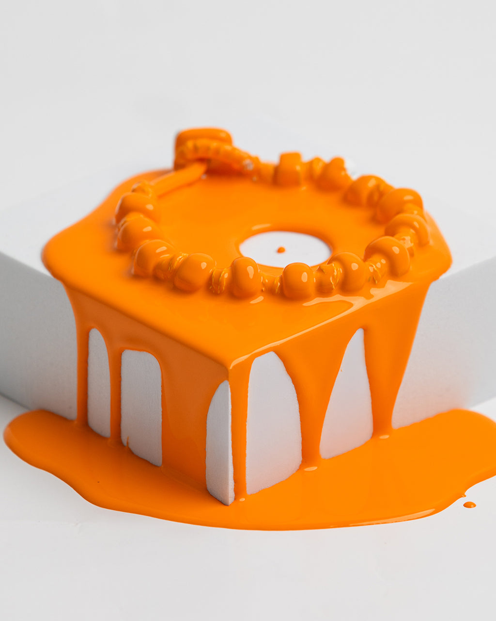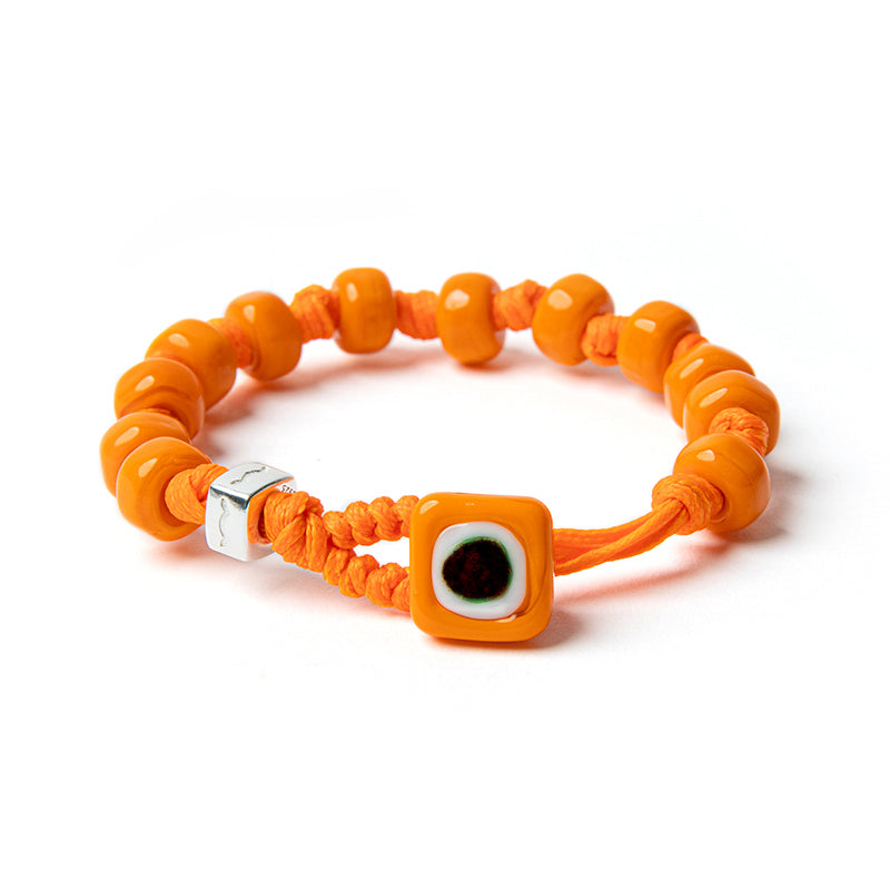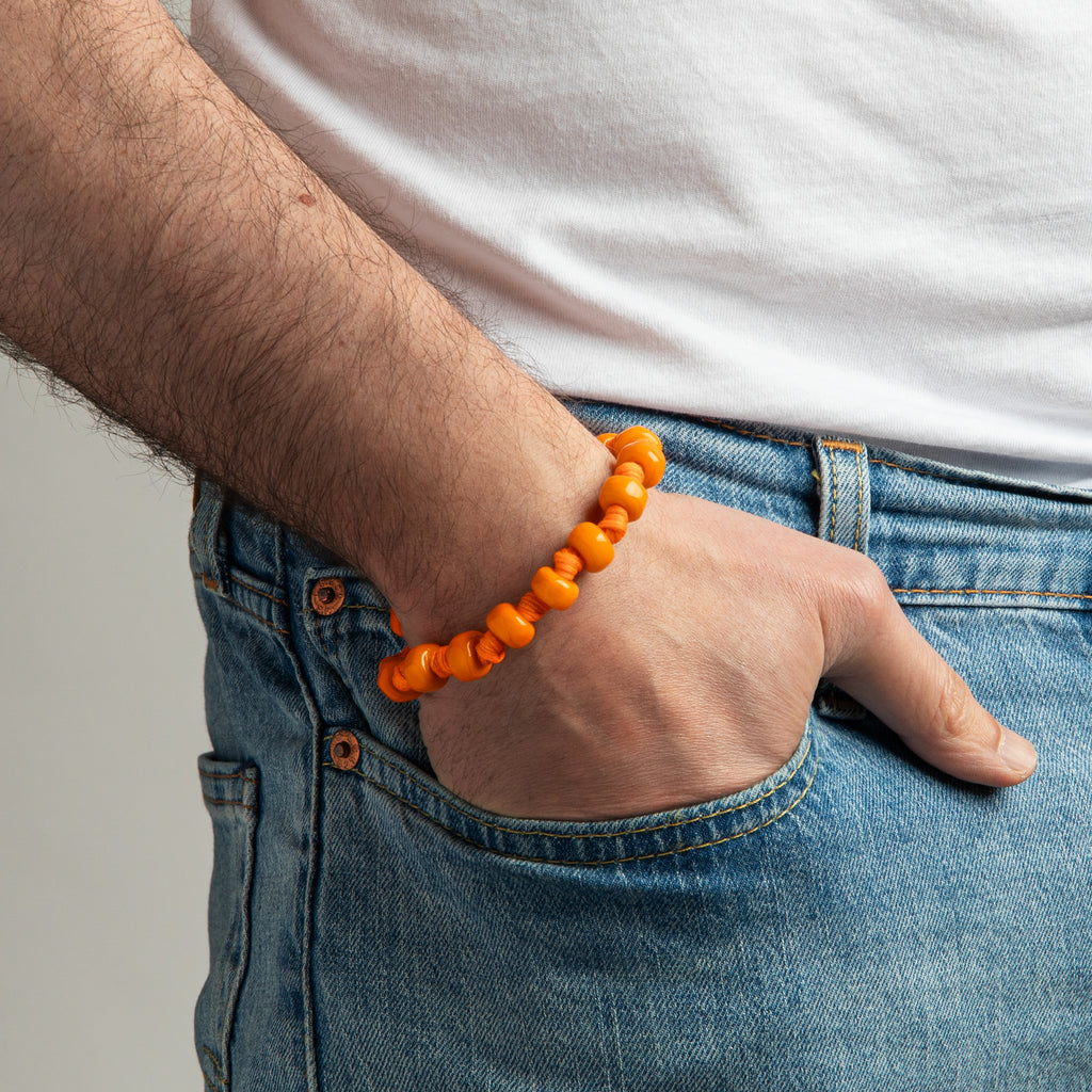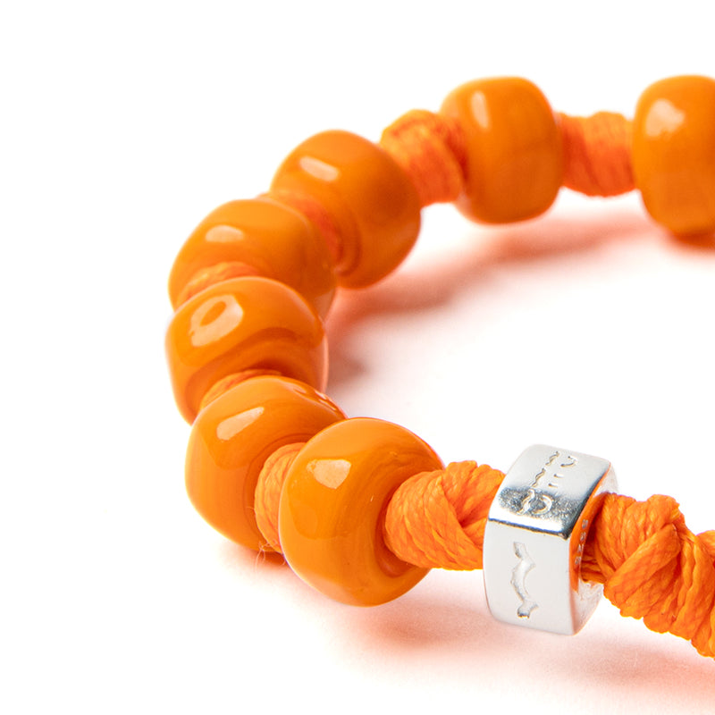 Bracelet for men and women featuring an orange waxed polyester cord, orange lampworked glass drops, orange glass closure disc, and a silver nut.
