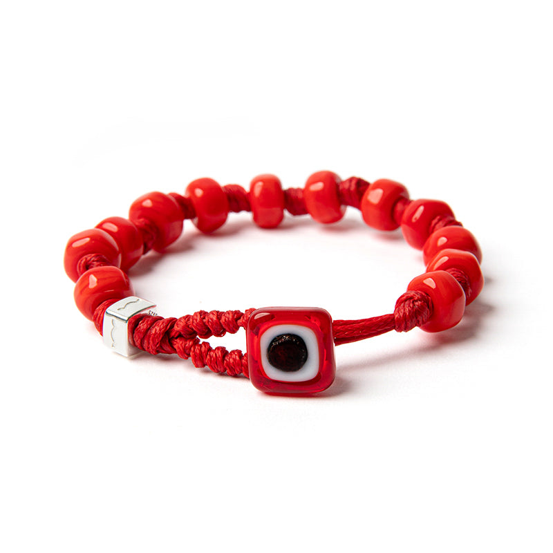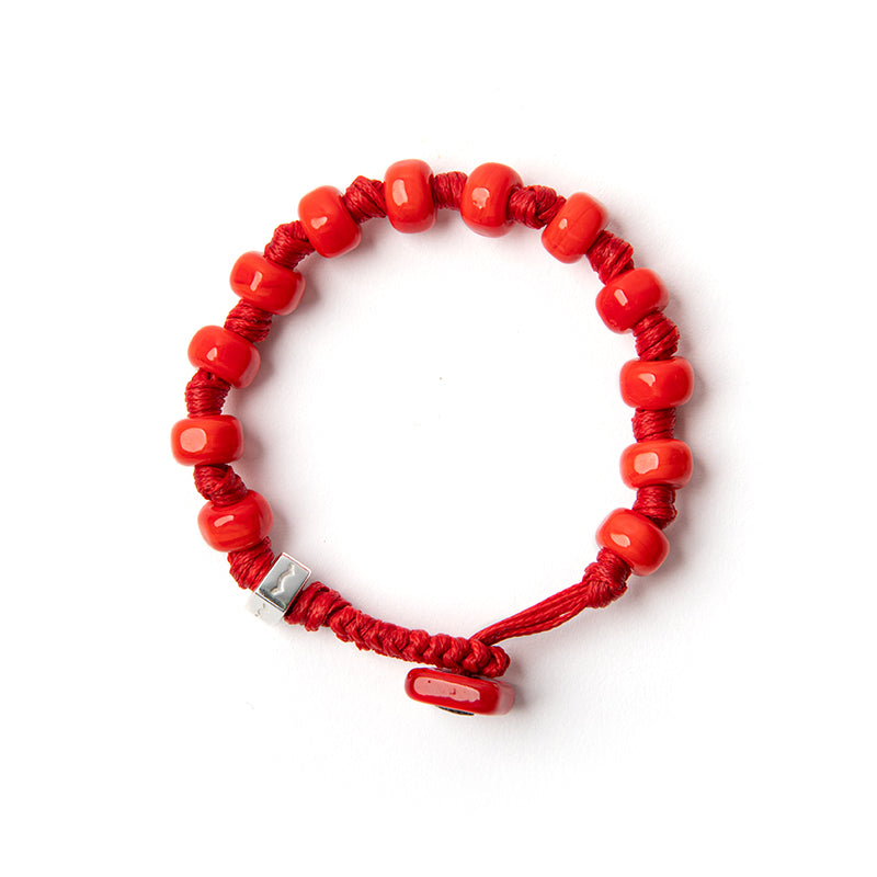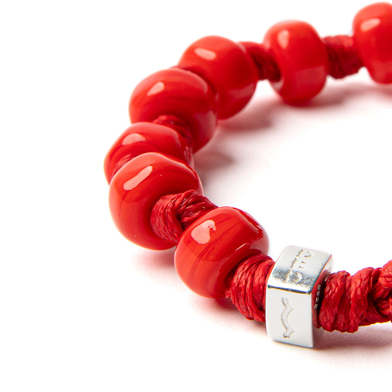 Bracelet for men and women featuring a red waxed polyester cord, red lampworked glass drops, a red glass closure disc, and a silver nut.
