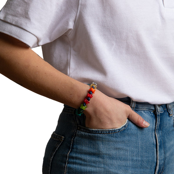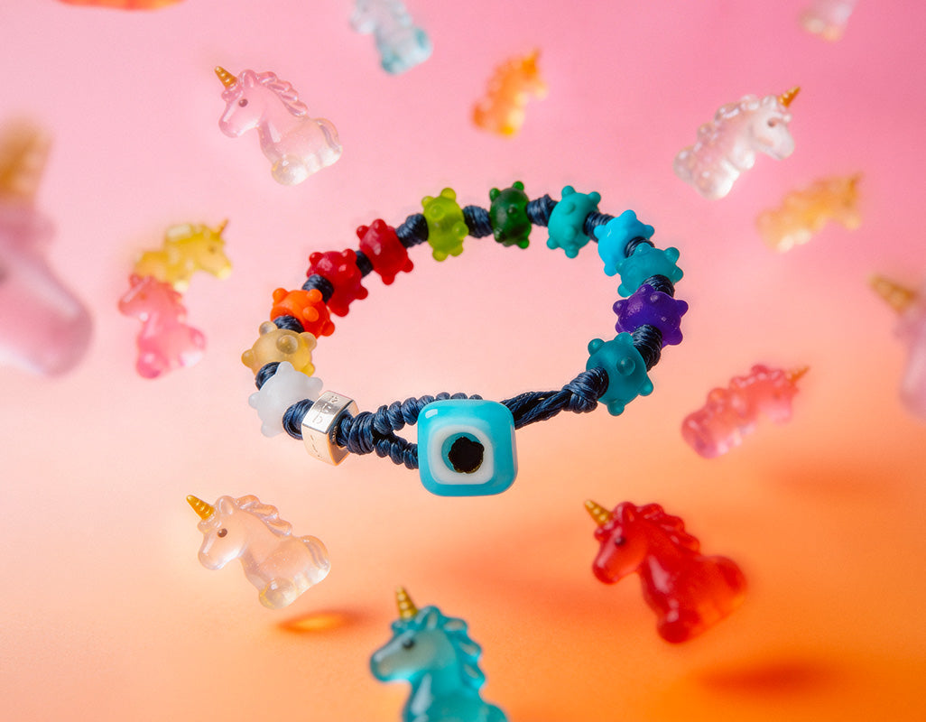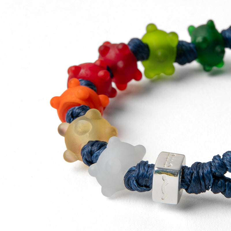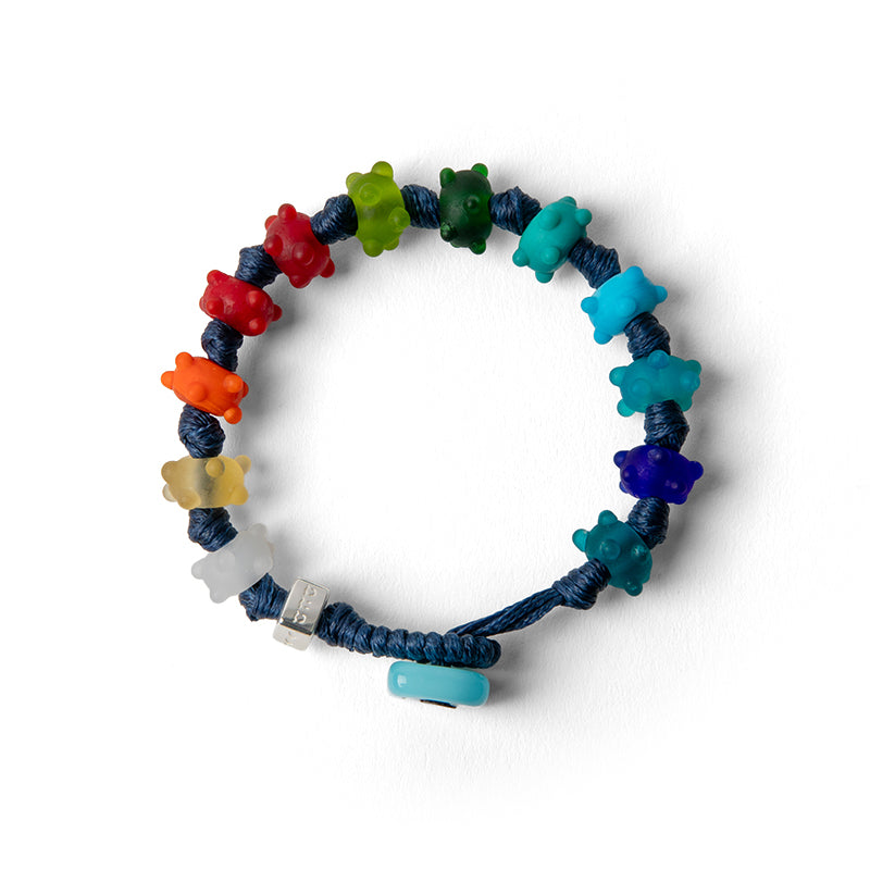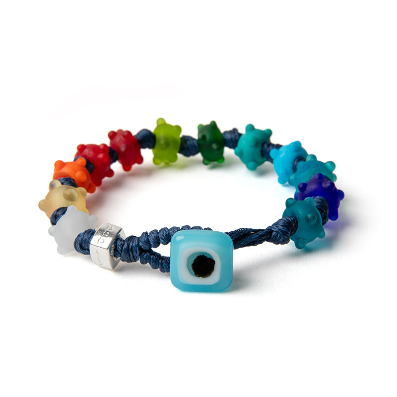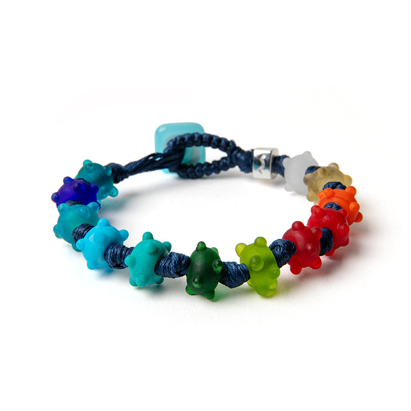Braccialetto per uomo e donna con cordoncino in poliestere cerato blu, gocce multicolor satinate con rilievi, disco di chiusura celeste in vetro e dado in argento.