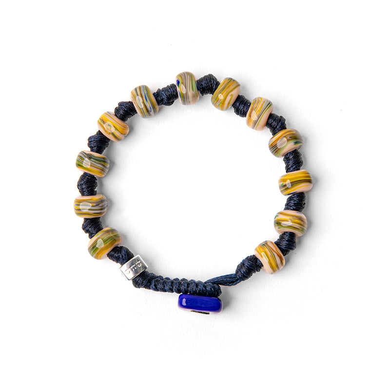 Braccialetto per uomo e donna con cordoncino in poliestere cerato blu, viola e rosso, gocce striate multicolor in vetro lavorato a lume, disco di chiusura blu e dado in argento.