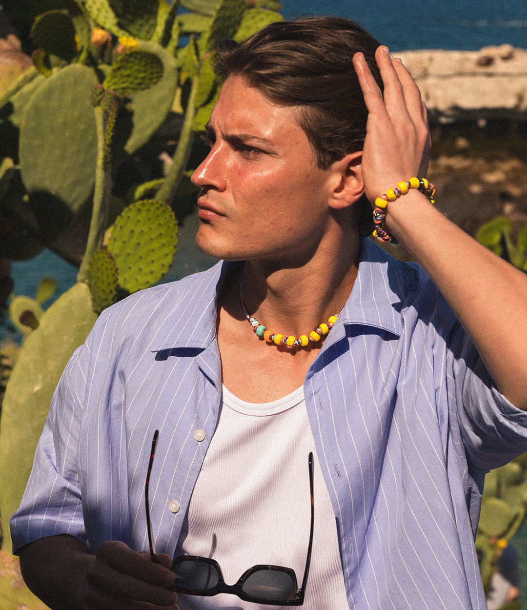 Collana e bracciale per uomo e donna con cordoncino in poliestere cerato multicolor, gocce gialle, arancioni e celesti in vetro lavorato a lume, disco di chiusura giallo in vetro e dado in argento.