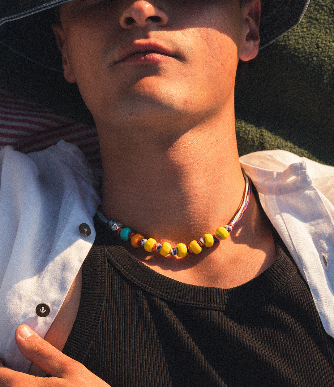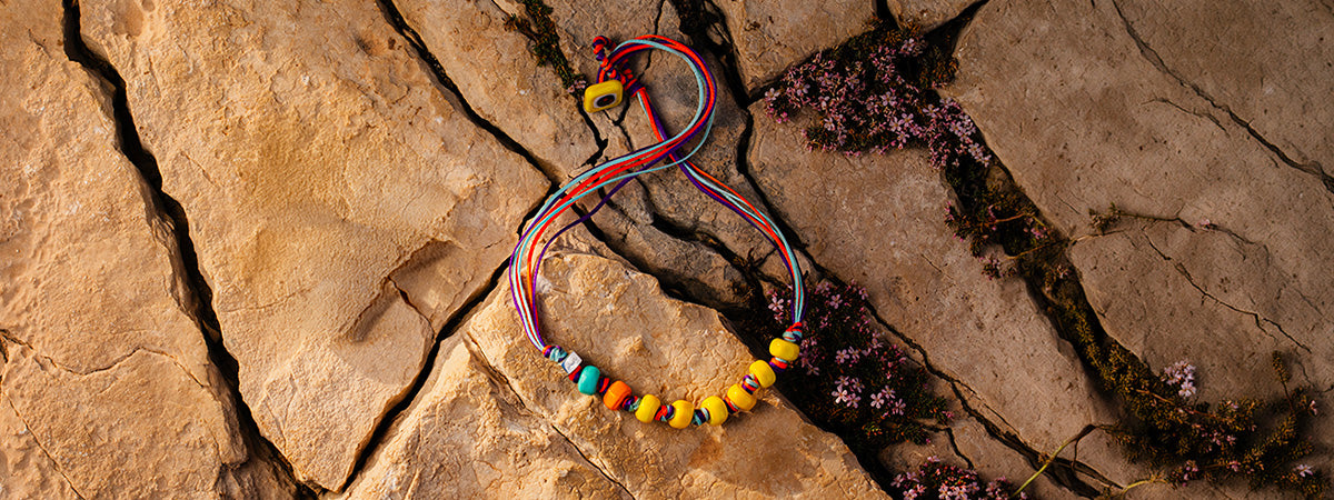 Collana per uomo e donna con cordoncino in poliestere cerato multicolor, gocce gialle, arancioni e celesti in vetro lavorato a lume, disco di chiusura giallo in vetro e dado in argento.