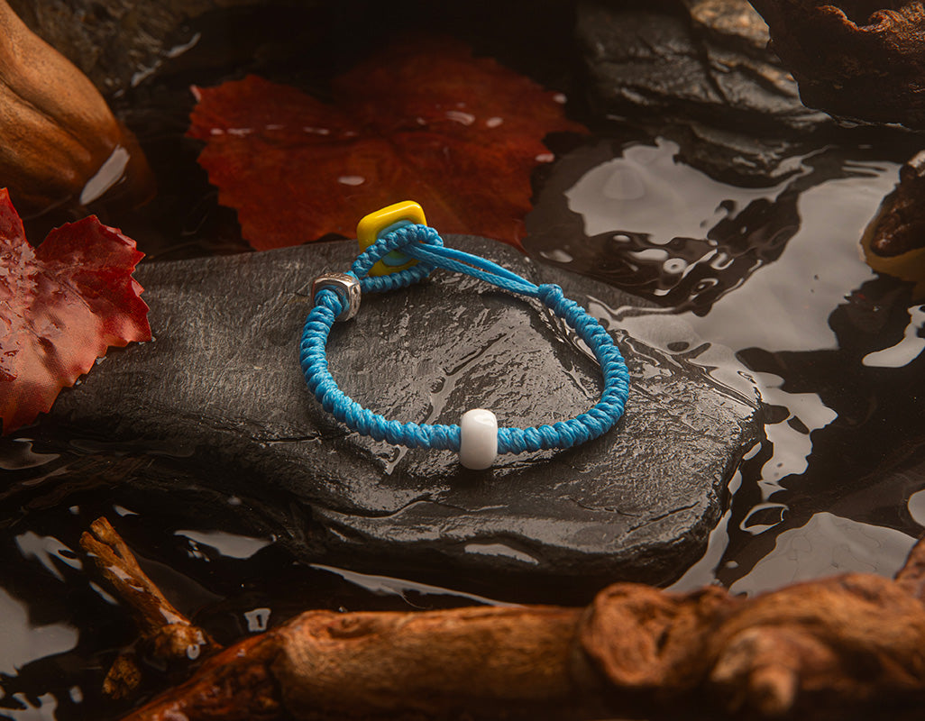Braccialetto per uomo e per donna con cordoncino azzurro intrecciato in poliestere cerato,  goccia in vetro bianca, disco di chiusura in vetro lavorato a lume e dado in argento 925.