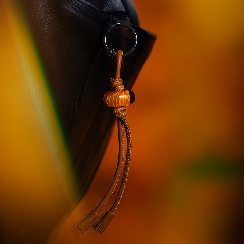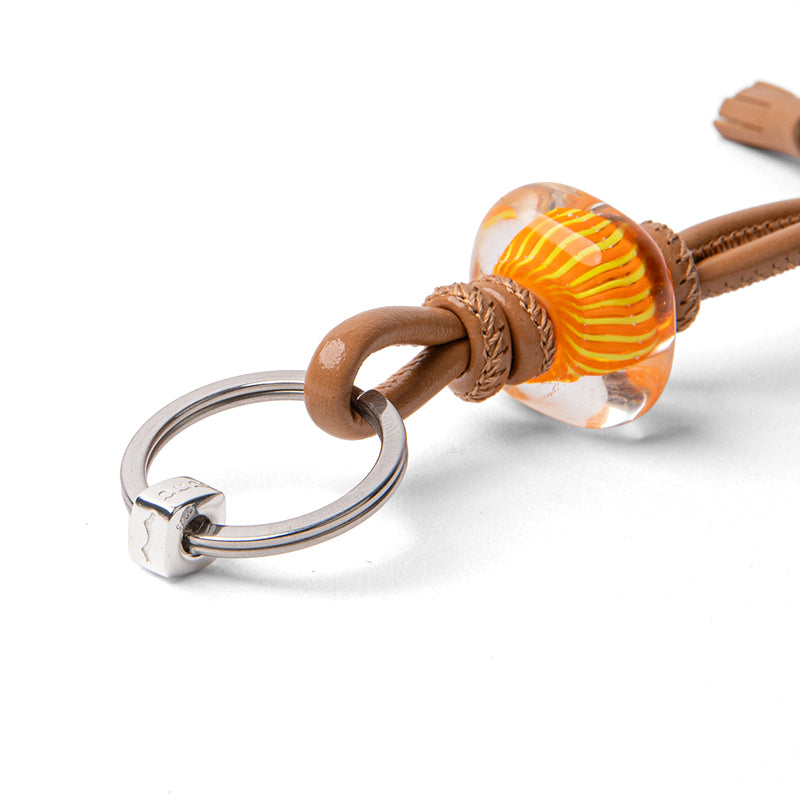 Portachiavi per uomo e donna con cordoncino in pelle beige, goccia maxi gialla lavorata in vetro lavorato a lume, anello in acciaio e dado in argento 925.
