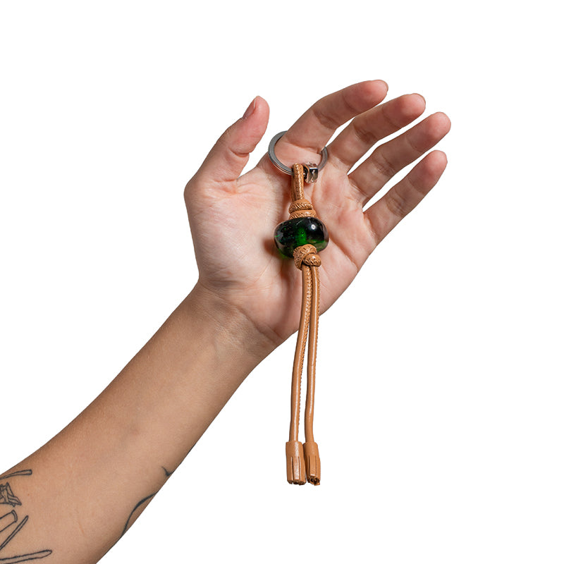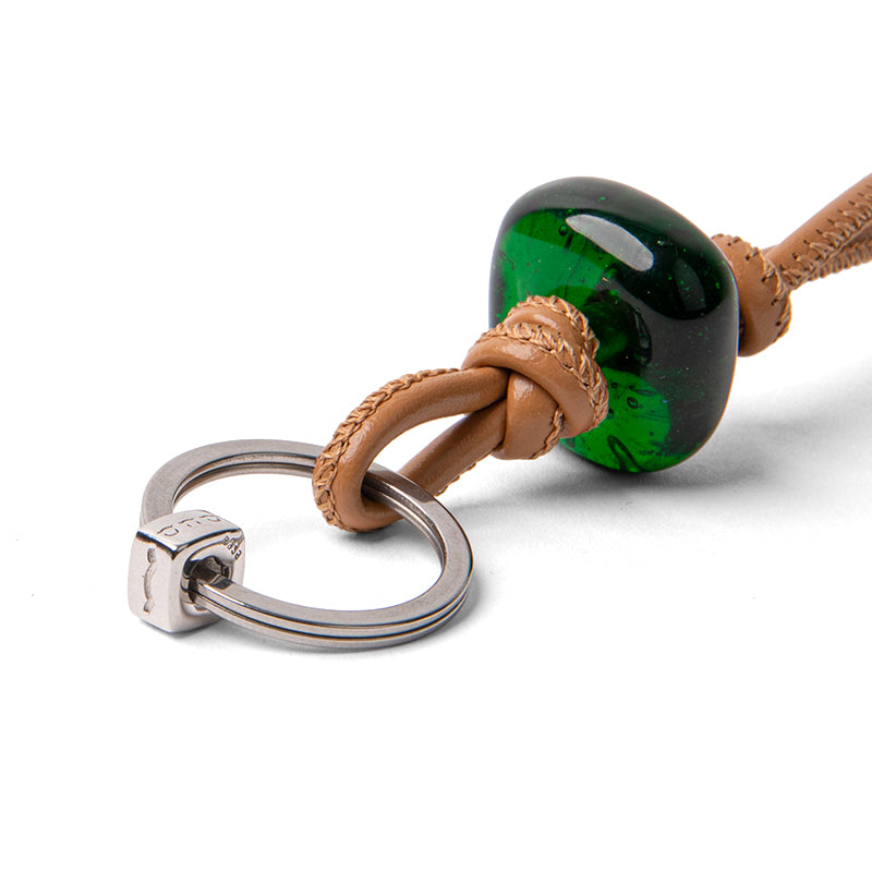 Portachiavi per uomo e donna con cordoncino in pelle beige, goccia maxi verde lavorata in vetro lavorato a lume, anello in acciaio e dado in argento 925.