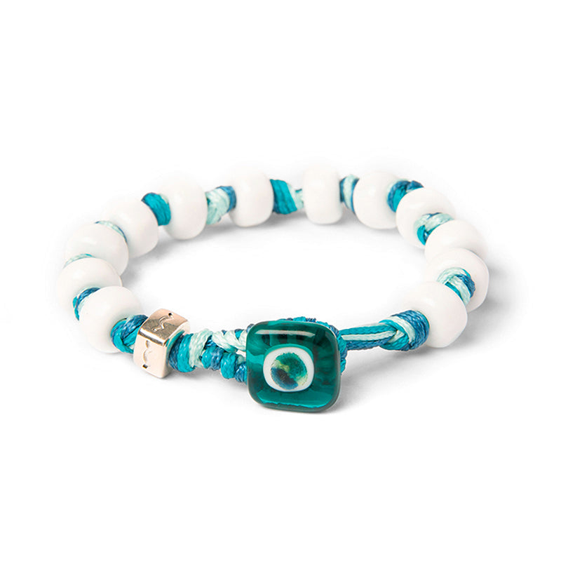 Braccialetto da uomo e donna con cordoncino intrecciato blu, azzurro e celeste in poliestere cerato e perle di vetro di colore bianco, con dettaglio in argento 925.