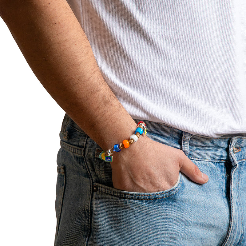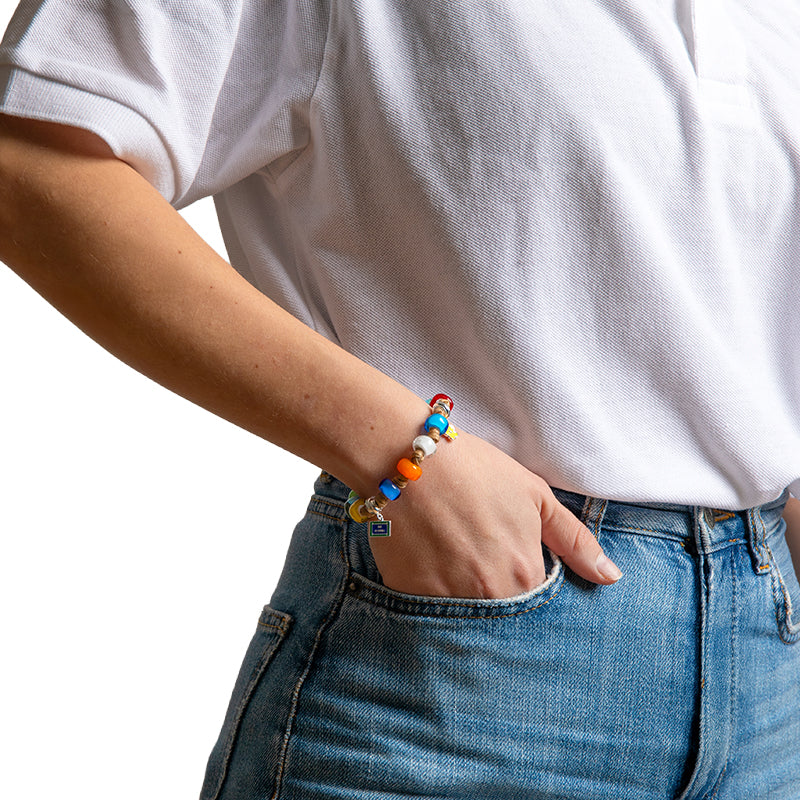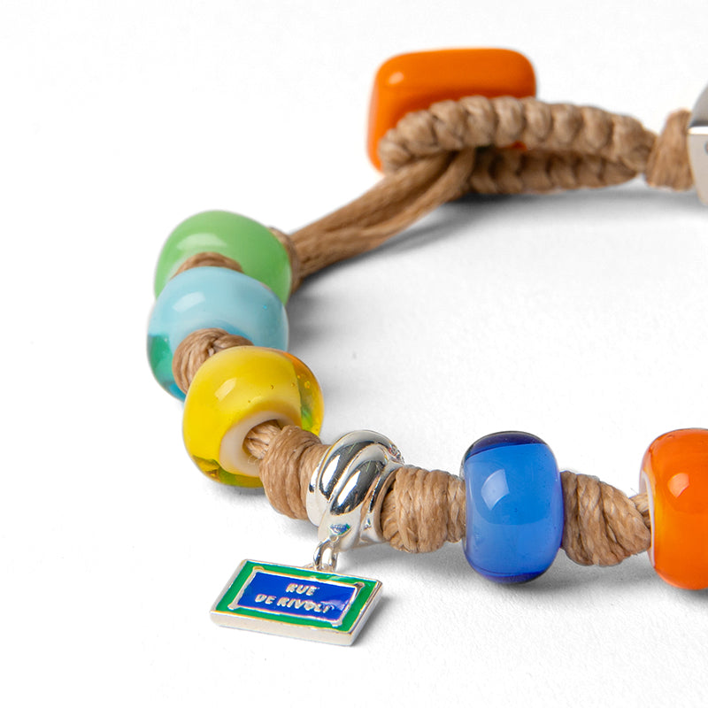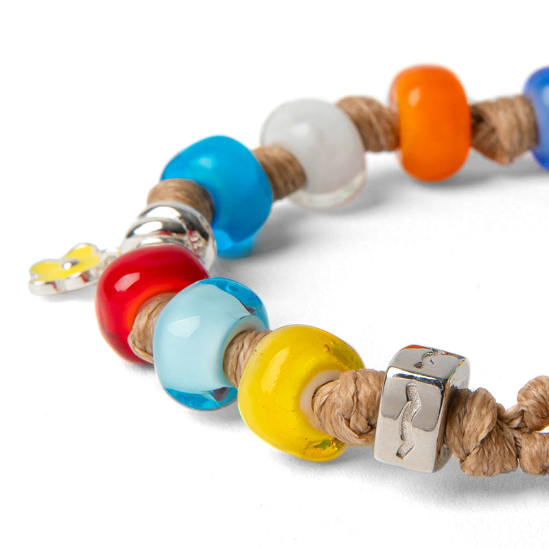 Braccialetto per uomo e donna con cordoncino in poliestere cerato beige, gocce rosse, celeste, gialle, blu e bianche, disco di chiusura arancione in vetro, charm in argento e dado in argento.