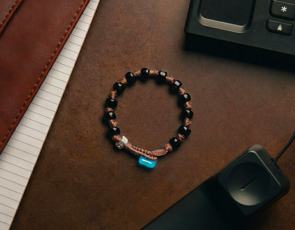 Braccialetto per uomo e donna con gocce di vetro nere, cordoncino marrone in poliestere cerato, disco di chiusura in vetro lavorato a lume e dado in argento.