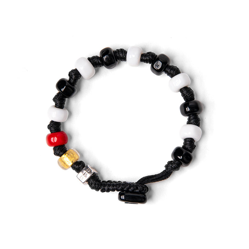 Braccialetto per uomo e donna con cordoncino in poliestere cerato nero, gocce bianca e dorata, gocce nere, goccia rossa in vetro lavorato a lume, disco di chiusura nero e dado in argento.